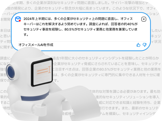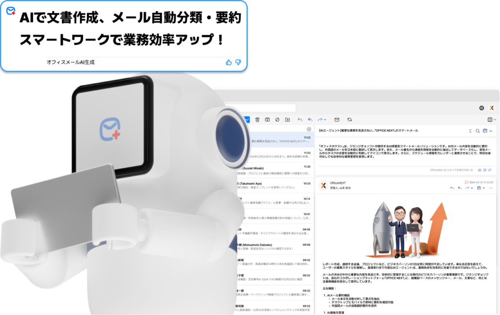 AIがメールの内容を自動的に要約します。 長いメールをすべて読む必要がなくなり、要点をすぐに把握できるので、業務効率が大幅に向上します。