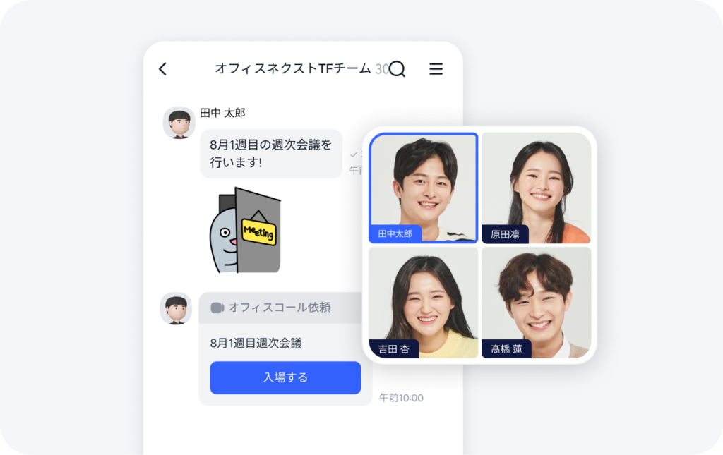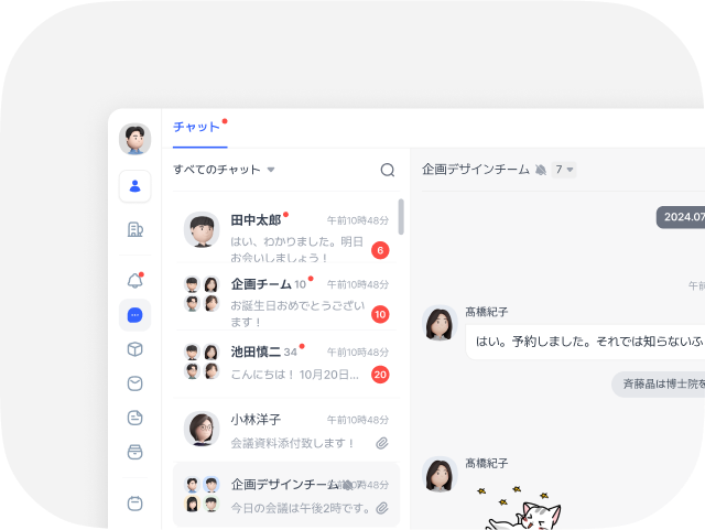 連絡したい人を組織図から選び、簡単な連絡はチャットで、報告書はメッセージで丁寧に、もし会議が必要ならビデオ会議、というように、必要なコミュニケーションをこれだけで簡単に行えます。また、AIによる文書作成やメッセージの自動分類、要約機能により、ビジネスの生産性もアップします。