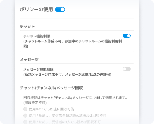メッセンジャーをインストールしているかどうか、およびインストール機器、OS、IP帯域に関する情報を確認することができます。 また、ユーザーごとにチャット、チャンネル、メッセージ送信制御、および回収機能を使用可能かどうかを管理することができ、セキュリティと可用性を高めることができます。