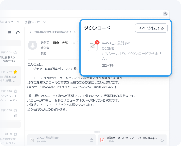 メッセンジャーに添付されたファイルの保存履歴を確認することができます。 送信者、保存者、ファイル名、保存日を確認して、ファイルの管理とセキュリティを強化できます。 すべての添付ファイルの保存履歴を明確に管理します。