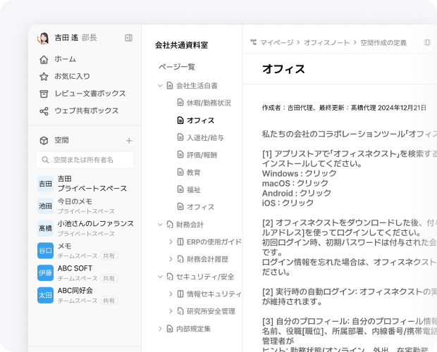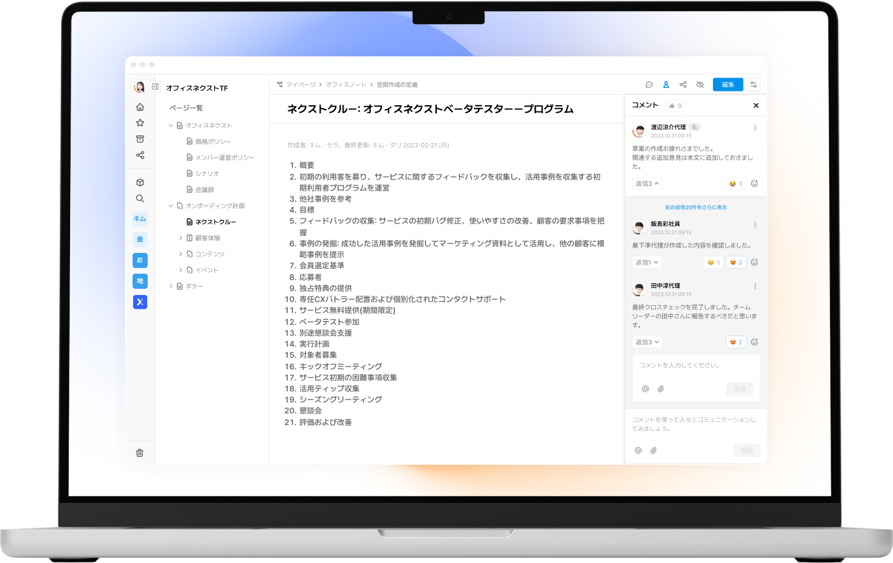 協業して文書で整理できます会社で使用頻度の高いテンプレートを共有フォーマットに設定し 標準化した文書を速やかに作成が可能です同時編集機能によってリアルタイムで協業しながら文書作成・修正が可能です。修正は直ちに反映されますので業務効率を高められます。